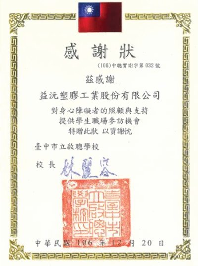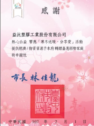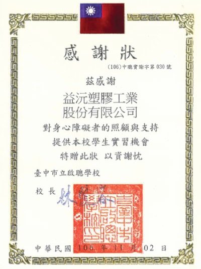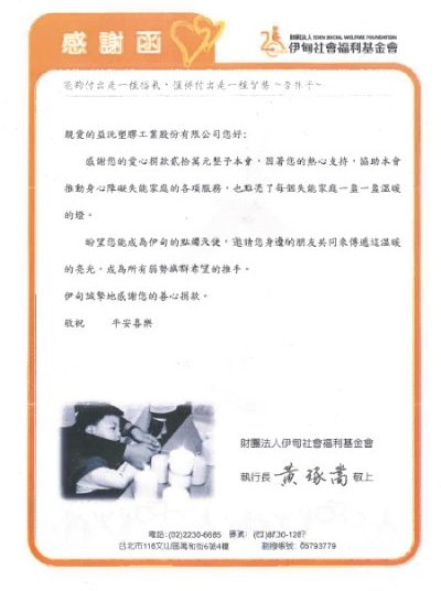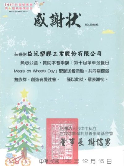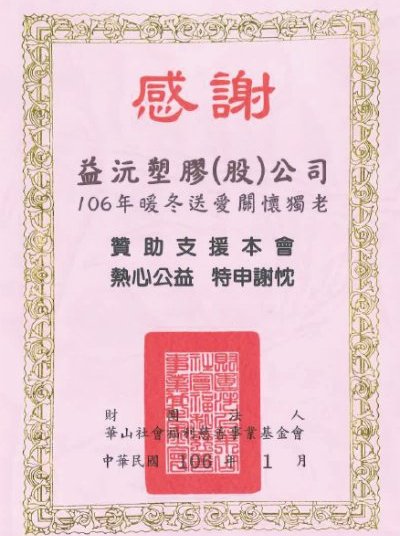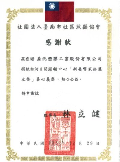 甘霖社会福祉慈善事業基金会のスポンサーとなり、寒い冬に寒さを凌ぐために暖かい毛布などを1人暮らしの老人に送ってあげたり、エデン社会福祉財団(身体障害者慈善団体)、台南市コミュニティケア協会(社会事業団)、家庭扶助基金会、心身障害者家庭、台中ろう学校と協力し、心身に傷害のある学生に仕事の技能を学習させる実習の機会を設けたりしています。